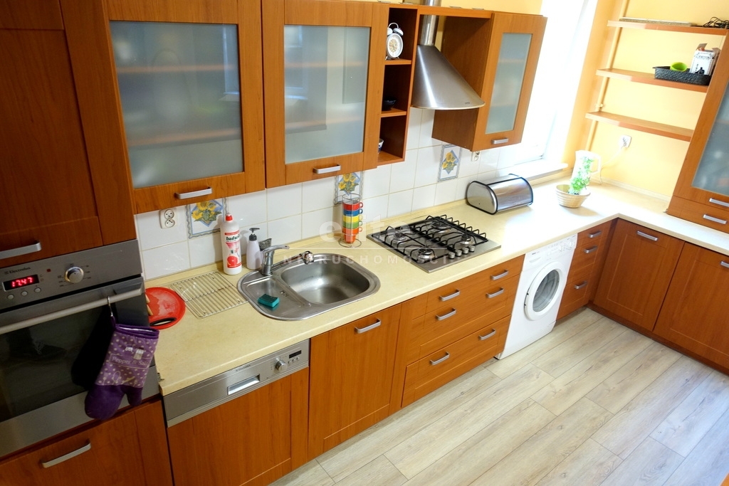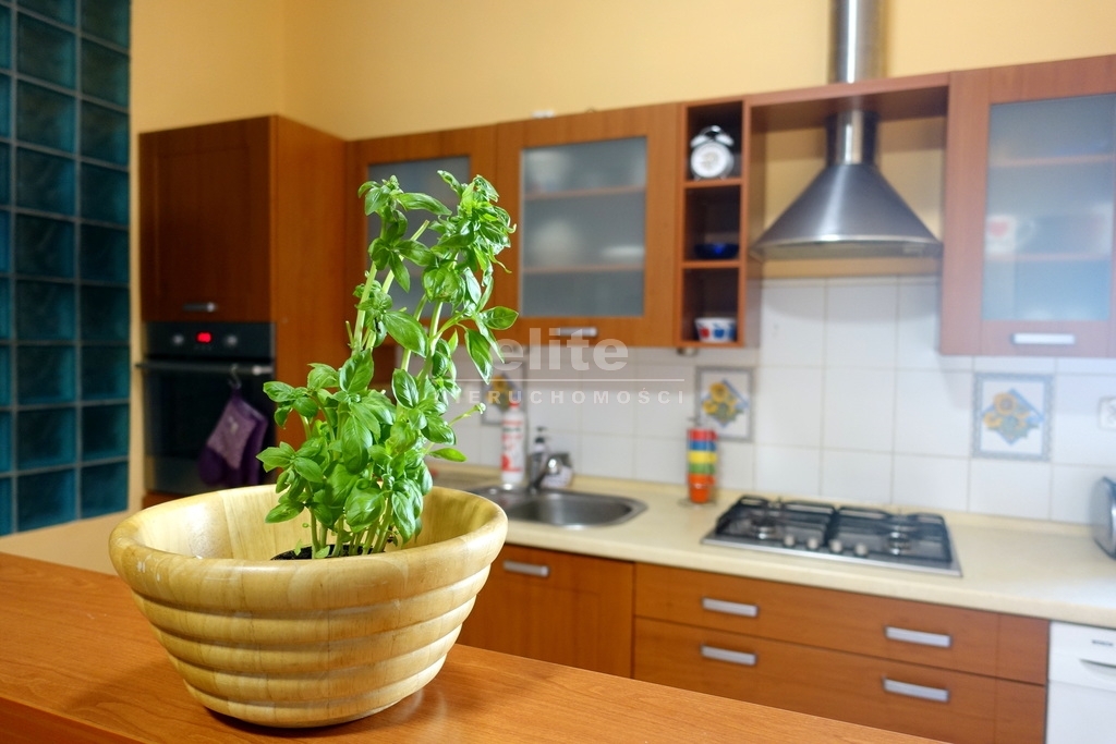 Widna i funkcjonalna kuchnia jest w pełni umeblowana i wyposażona w kuchenkę gazową z piekarnikiem, lodówkę, kuchenkę mikrofalową i pralkę.
