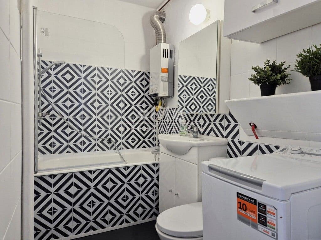 * łazienka z wanną, wc, umywalką i pralką