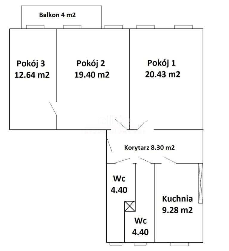 3 pokoje, kuchnia, 2 łazienki (jedna z wanną, druga z prysznicem).