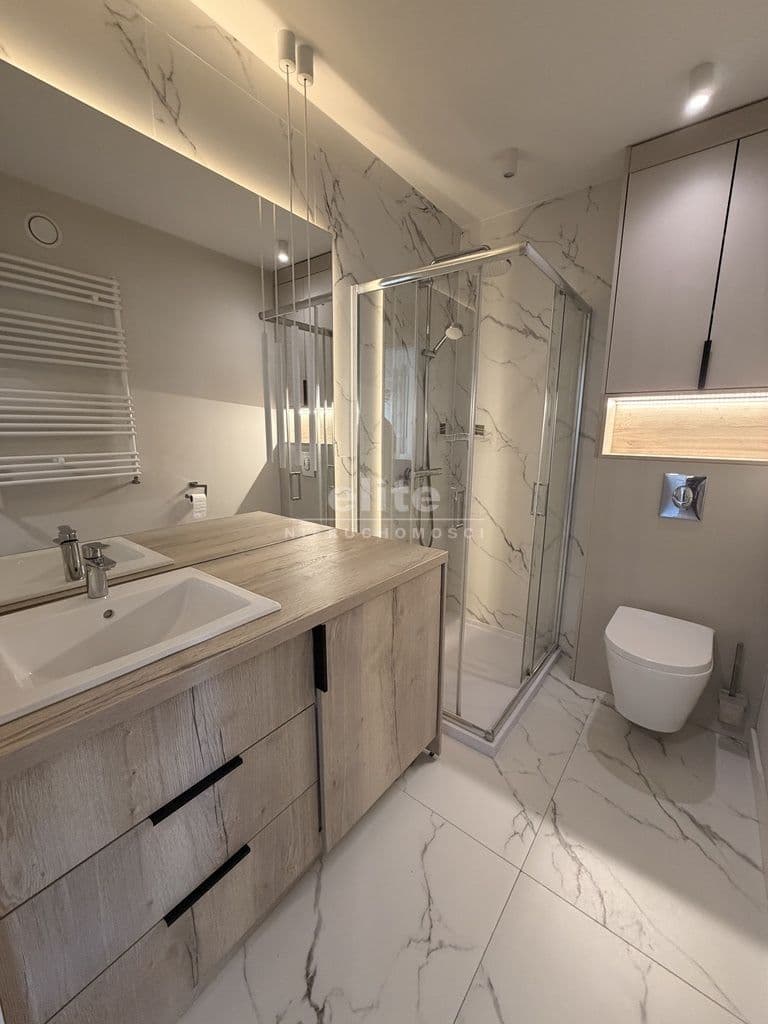 Mieszkanie znajduje się na 6. piętrze i zostało zaprojektowane z dużym wyczuciem stylu – wszystkie meble wykonano na wymiar, dzięki czemu wnętrze jest nie tylko nowoczesne, ale też wyjątkowo funkcjonalne. Jasny salon z rozkładaną sofą tworzy przytulną strefę wypoczynkową, a wydzielona część jadalniana doskonale sprawdza się do codziennych posiłków lub pracy przy laptopie. Aneks kuchenny został w pełni wyposażony w sprzęt AGD w zabudowie – zmywarkę, płytę, piekarnik i lodówkę. W łazience znajduje się prysznic oraz pralka, a pojemna szafa w zabudowie zapewnia dużo miejsca do przechowywania. Z salonu można wyjść na przestronny balkon z przyjemnym widokiem, idealny na poranną kawę lub wieczorny relaks.
