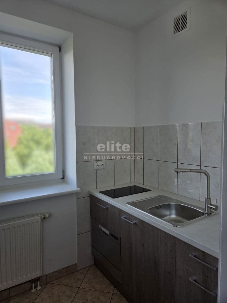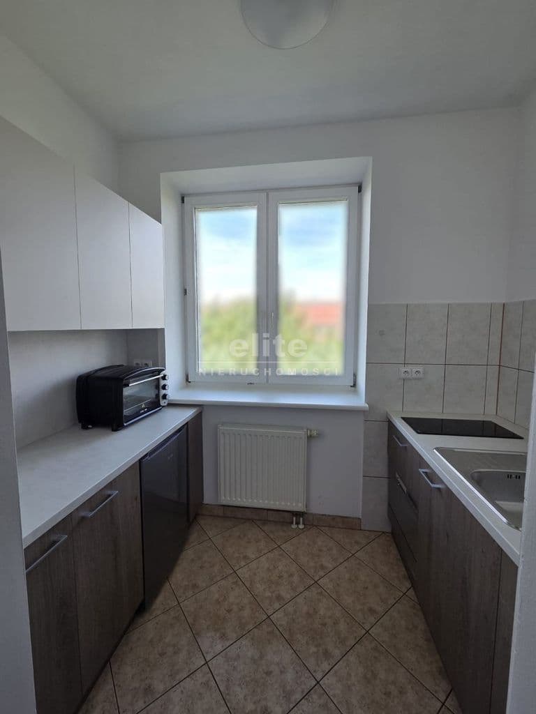 Kuchnia osobna, widna, z oknem, wyposażona w meble w zabudowie i sprzęt AGD (lodówka, piekarnik, zmywarka), na podłodze kafle.