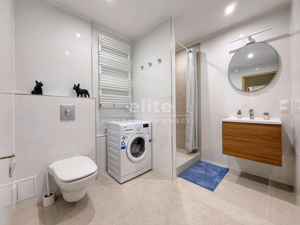 Łazienka wyposażona w prysznic, zlew, muszlę oraz pralkę automatyczną.