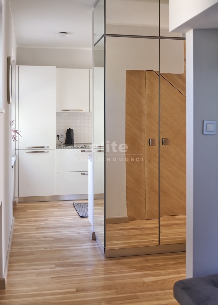 This unique proposition is perfect for those seeking comfort, elegance, and a closeness to nature – in one of the city's most prestigious locations. Property features: The apartment is located on the second floor of a cozy building built in 2004, equipped with an elevator. The apartment faces the courtyard, with a south-east exposure, ensuring peace and quiet, offering excellent sunlight throughout the day. Layout: Level 1: entrance with built-in wardrobe, spacious living room with dining area and balcony access, fully equipped kitchen (electric hob, oven with microwave, dishwasher, fridge-freezer, kettle), toilet, and practical storage under the stairs. Level II: a bedroom with access to a terrace encompassing the entire floor, overlooking the treetops, an elegant bathroom with a shower, bidet, toilet, built-in washing machine, and makeup area, and a functional walk-in wardrobe. Finishes and Style: The apartment underwent a complete renovation in 2024. It was furnished with attention to detail and quality finishes, using natural materials: ash floors, Italian furniture, wool carpets, natural stone in the kitchen and bathroom, designer lighting, and accessories. This space combines elegance with the warmth of a homely interior – a place you truly want to live in. Additional Information: A lockable garage in the garage hall beneath the building is included in the rental price. The building also features a café serving excellent breakfasts. Heating and hot water are provided by the municipal network (SEC). The apartment can be rented fully furnished (as shown in the photos) or empty – depending on the tenant's preferences. Note: The apartment remains rented until the end of October 2025. Lease terms: Rent: PLN 5,500 / month Administrative rent: PLN 608 / month (includes advance payments for water, waste collection and operating costs) Utilities according to consumption: electricity (ENEA), city heating (SEC).
