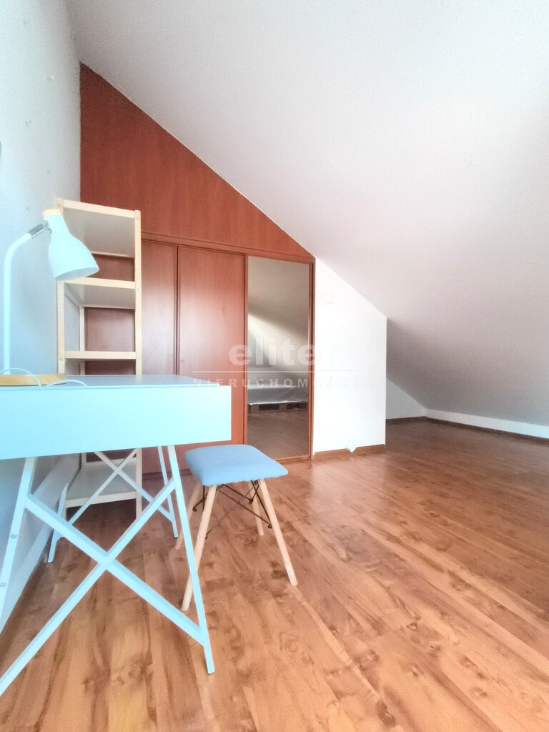 - Na tym samym poziomie znajduje się łazienka z prysznicem, w jasnej kolorystyce. Z salonu prowadzą schody na poddasze, które pełni funkcję sypialni.