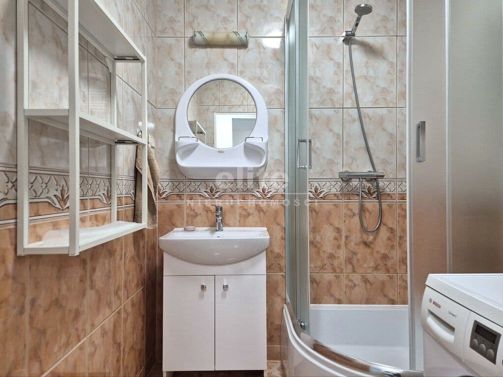 - Łazienka z kabiną prysznicową, umywalką oraz pralką
