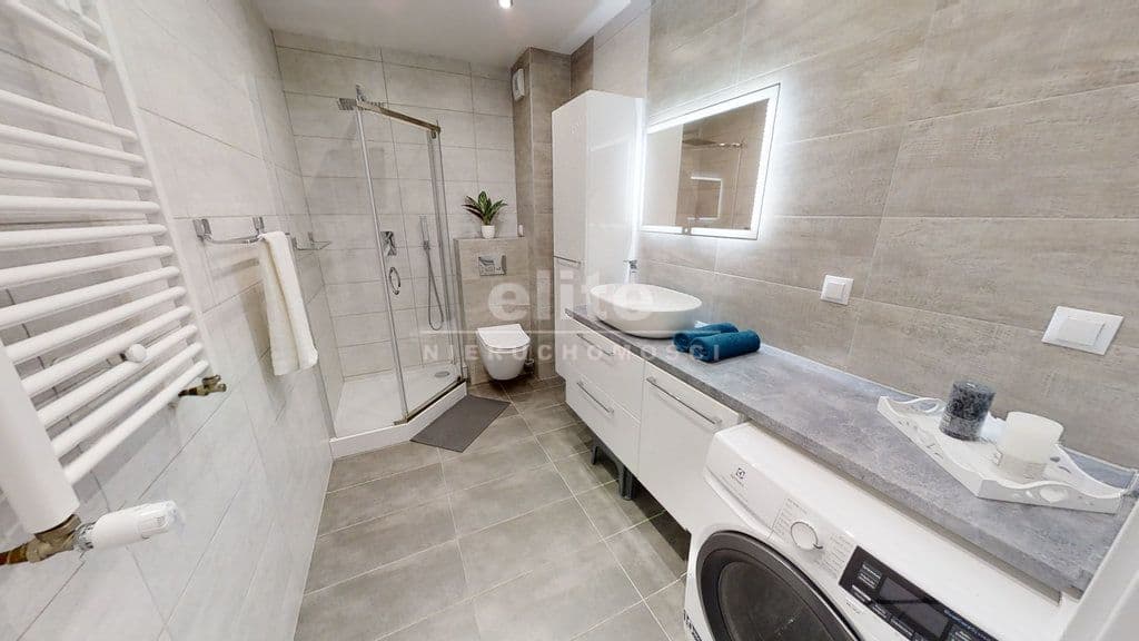 ---> Łazienka (pralka, umywalka, toaleta, kabina prysznicowa, grzejnik drabinkowy)