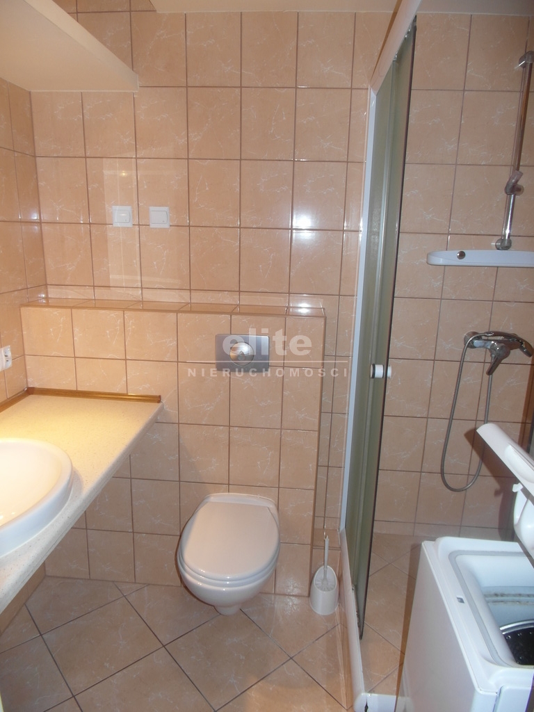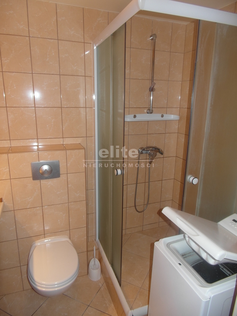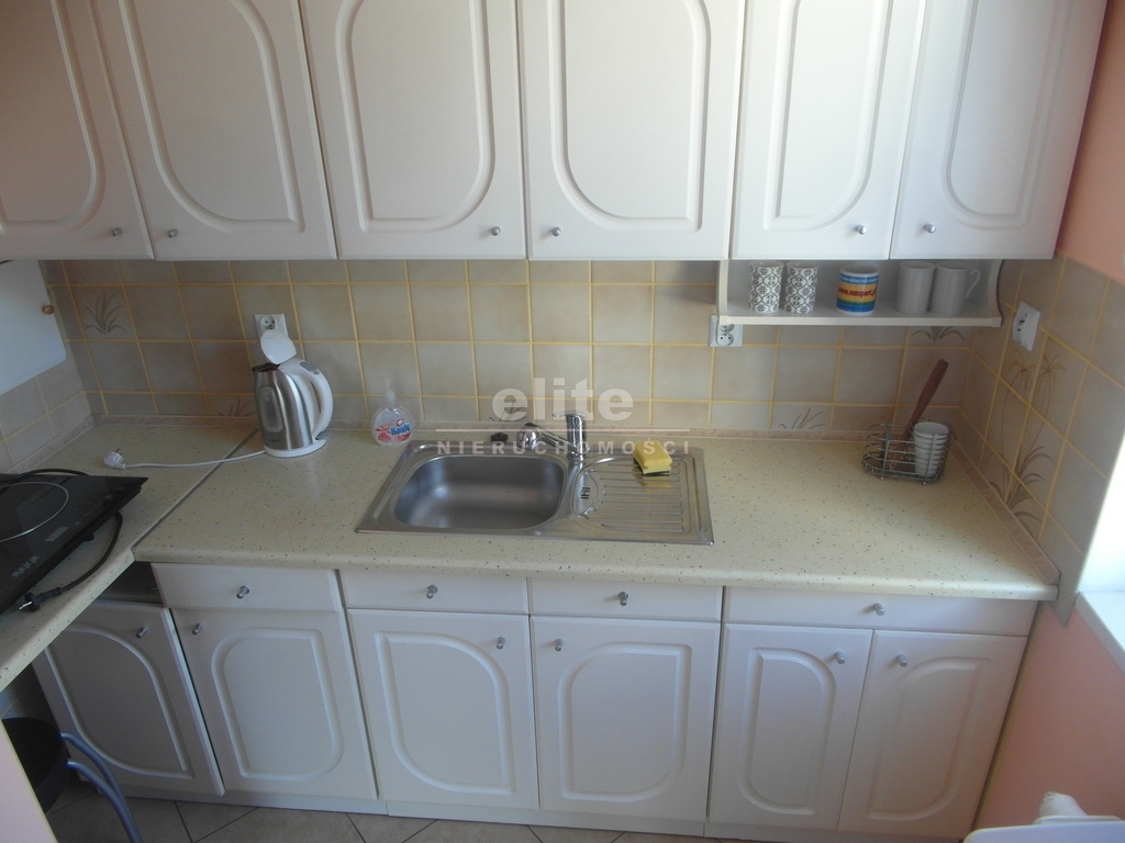 Mieszkanie składa się z większego pokoju o powierzchni 15m2 z wyjściem na duży balkon, maleńkiej sypialni 5m2, osobno kuchni 5m2 z oknem, łazienki z toaletą oraz przedpokoju. Mieszkanie oferowane jest do wynajmu po gruntownym remoncie. W pokojach na podłodze nowe panele, ściany gładzone i pomalowane w delikatnym kolorze (jedna ze ścian wykończona ozdobnym tynkiem strukturalnym). W większym pokoju znajduje się nowa, rozkładana kanapa dwuosobowa, stolik z telewizorem, dwie komody z szafkami i szufladami oraz obszerna szafa. W mniejszym pokoju znajdują się dwa regały z witrynami (typu POP) i łóżko. W kuchni nowe kafle na podłodze i fartuch kafelek na ścianach plus: umeblowanie wykonane na wymiar w kolorze waniliowym, nowsza lodówka (na zdjęciu widoczna jeszcze starsza), nowa kuchenka indukcyjna, pochłaniacz oraz czajnik elektryczny. W łazience kafle na podłodze i kafelki na ścianach plus: kabina prysznicowa, umywalka z blatem i szerokim lustrem wtopionym w kafelki oraz kinkietami, muszla podwieszana na geberycie. W przedpokoju kafle na podłodze (plus nowy wieszak na ubrania - na ścianie).