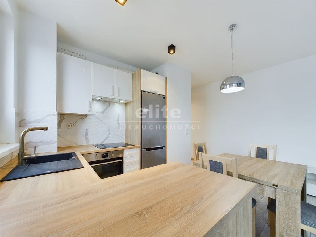 - przestronny salon z aneksem kuchennym wyposażonym w płytę, piekarnik, zmywarkę, lodówkę, zlew, okap i meble na wymiar, z którego mamy bezpośrednie wyjście na balkon. W salonie znajduje się rozkładana kanapa, komoda, telewizor oraz stół + 4 krzesła