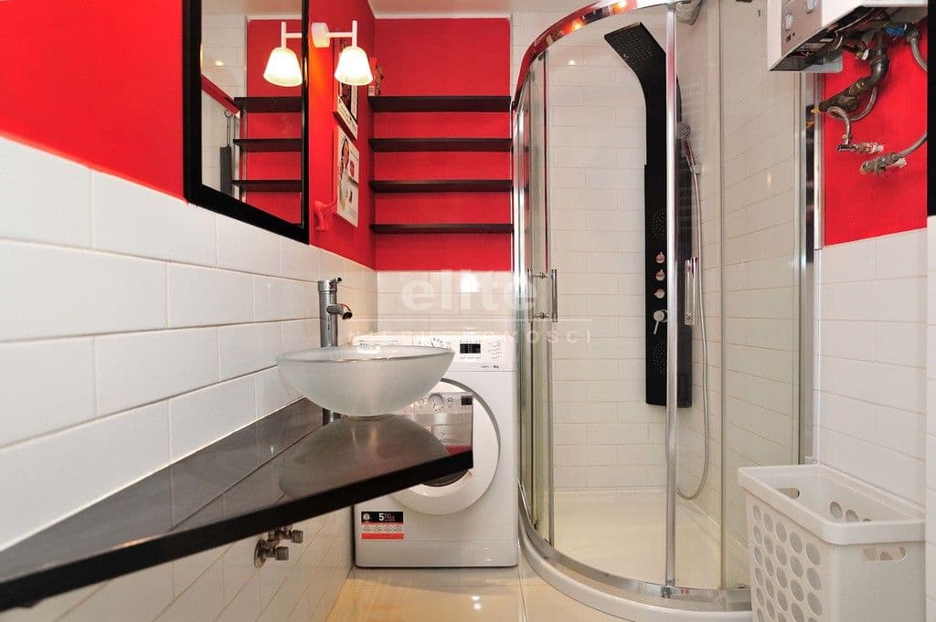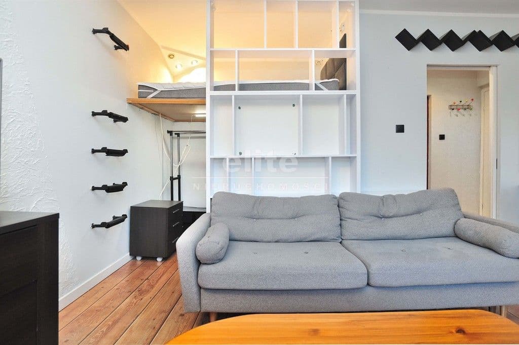 OPIS MIESZKANIA: Do wynajęcia mieszkanie znajdujące się na parterze XII-piętrowego wieżowca. Jego całkowita powierzchnia wynosi 30,81 m2, jest w pełni umeblowane i wyposażone. W mieszkaniu znajduje się pokój z aneksem kuchennym i wyjściem na balkon, łazienka z WC oraz przedpokój. Łazienka wyposażona jest w kabinę prysznicową, pralkę, umywalkę z lustrem, półki na kosmetyki, wc, grzejnik drabinkowy. Kuchnia jest umeblowana i wyposażona w sprzęt AGD - kuchenkę gazową z piekarnikiem elektrycznym, lodówkę z zamrażalnikiem, zmywarkę. W pokoju jest rozkładana kanapa, biurko, cztery stoliki, lampa podłogowa, regał na książki, komoda, szafka, półka nad drzwiami. Niewątpliwym atutem kawalerki jest także wydzielone miejsce do spania za pomocą antresoli z wygodnym materacem i mieszcząca się pod nią garderoba.