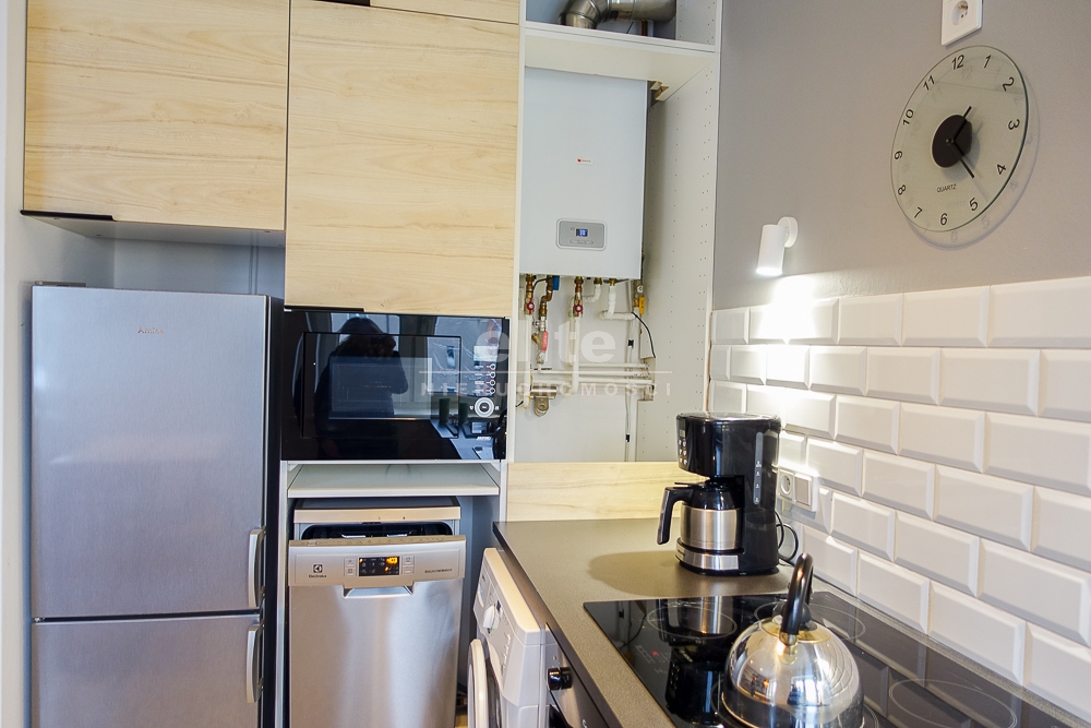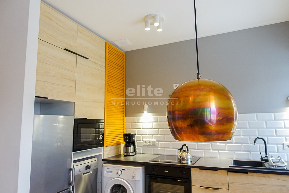 Pokój dzienny z aneksem kuchennym w nowoczesnej zabudowie meblowej wraz z urządzeniami AGD: zmywarka ELEKTROLUX 45 cm, piekarnik elektryczny CANDY, płyta ceramiczna BOSCH, lodówka z zamrażarką AMICA, pralka. Na podłodze w aneksie kuchennym terakota, na ścianie pas glazury.