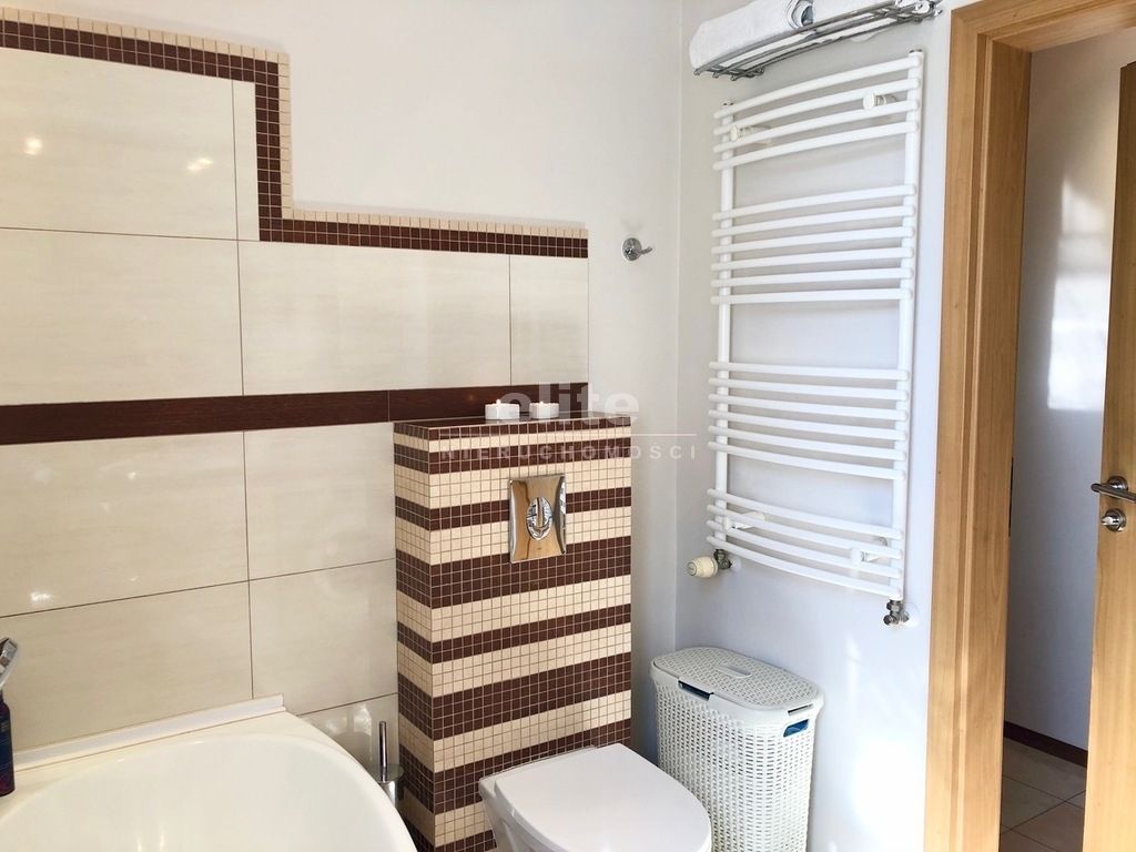 - Łazienka – jasna i funkcjonalna, wyposażona w wannę Ravak z funkcją prysznica, pralkę Bosch i armaturę HansGrohe. Dodatkowym atutem jest duże okno zapewniające naturalne światło.