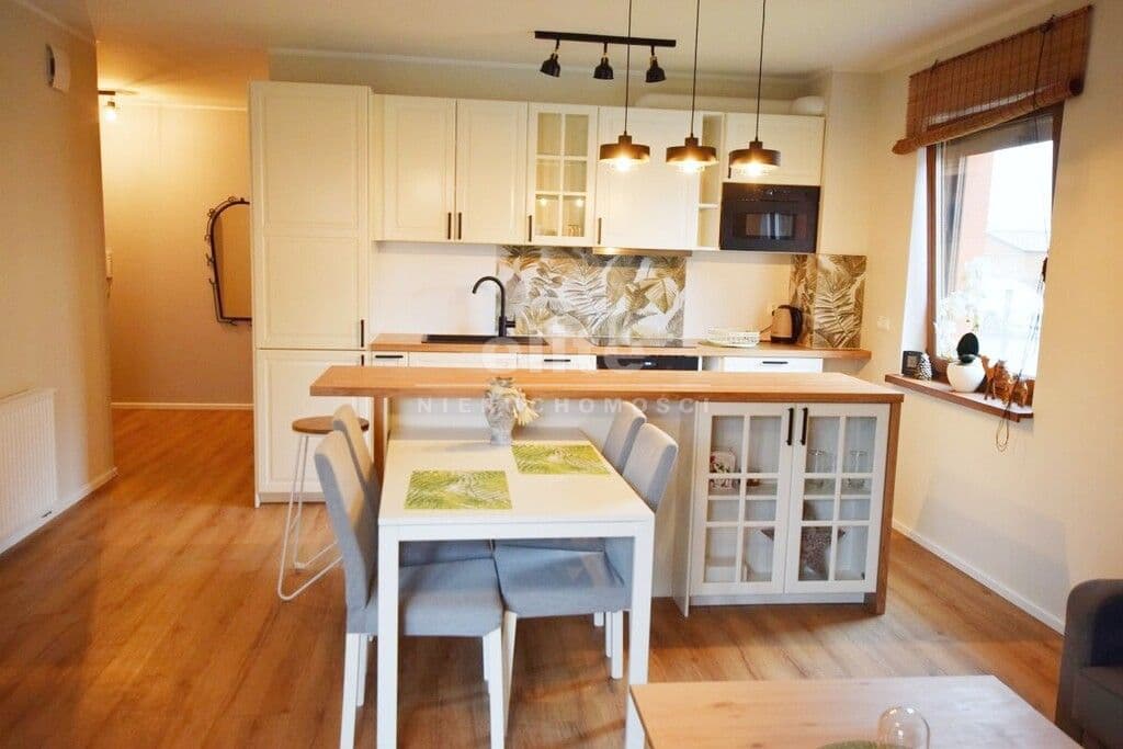 Mieszkanie nowe, w bardzo dobrym standardzie, czyste i zadbane. Rozkładowy układ pomieszczeń. Składa się z salonu z aneksem kuchennym z wyspą, oraz dwóch sypialni łazienki i przedpokoju. Kuchnia w pełni wyposażona w AGD: lodówkę z zamrażalnikiem, zmywarkę, płytę indukcyjną, okap.