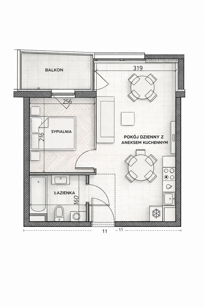 • Salon z aneksem kuchennym – nowoczesna, w pełni wyposażona przestrzeń
