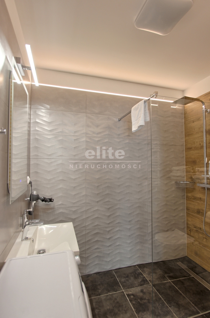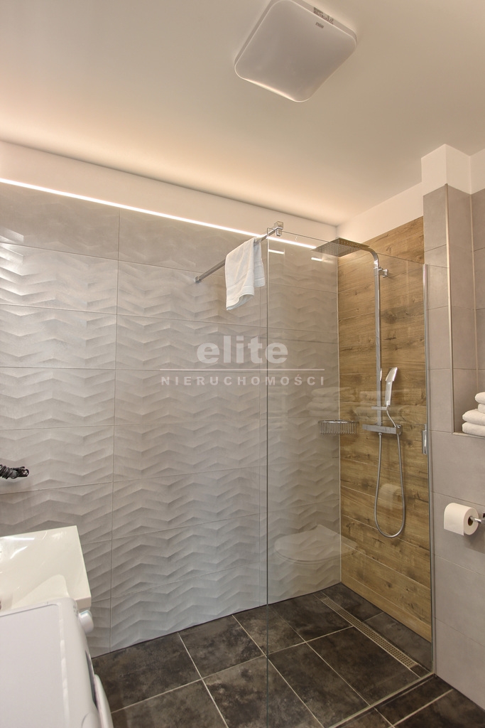 Szafy w zabudowie, telewizor, wyposażona kuchnia, pralka, kabina prysznicowa w łazience.