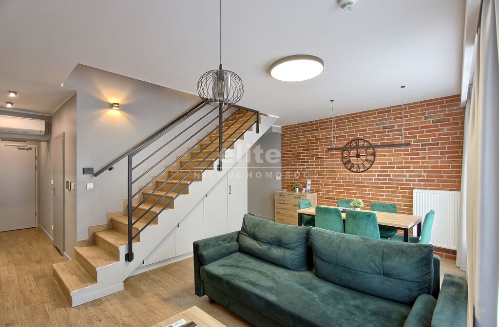 Mieszkanie 2 - poziomowe, z 2 sypialniami na drugim poziomie i częścią dzienną - salon z aneksem kuchennym na dole.