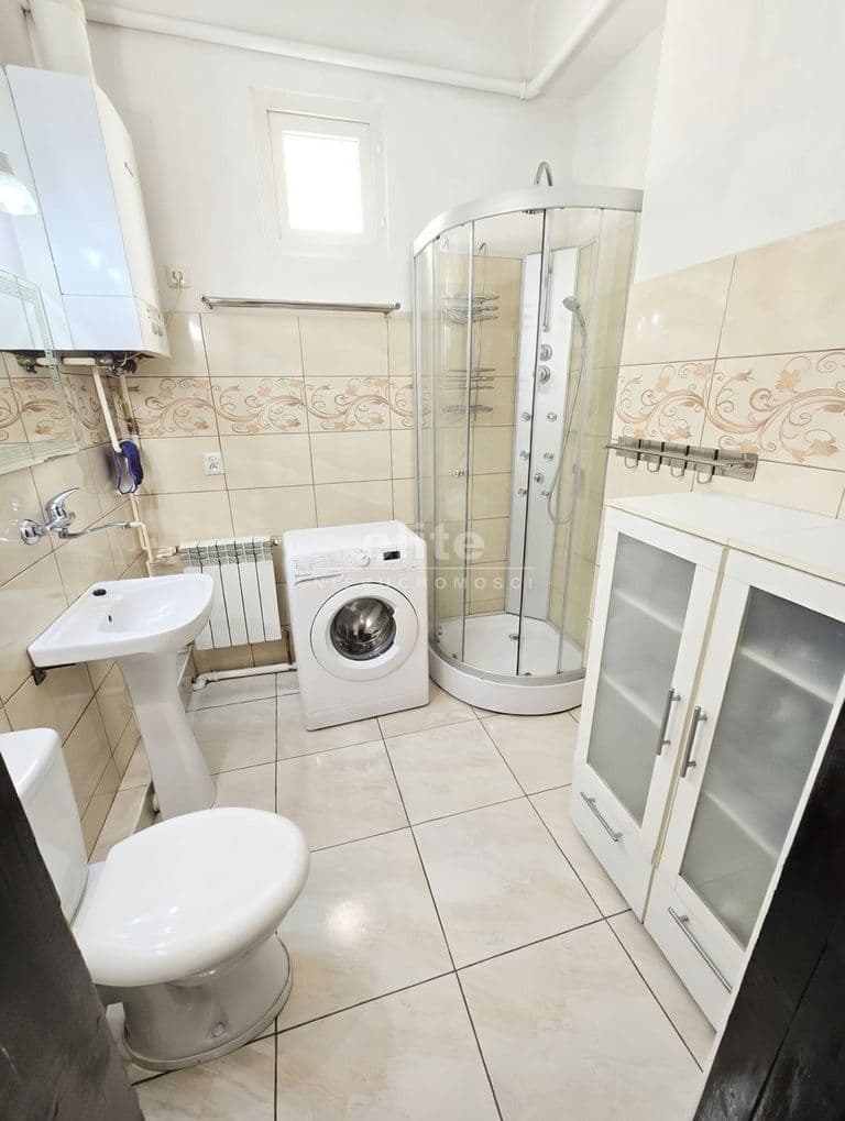 - Łazienka z prysznicem, pralką, umywalką, WC i szafką