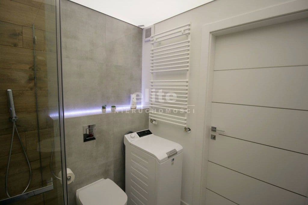 * Łazienka- sufit napinany, podświetlany- dający wrażenie rozproszonego światła dziennego, kabina prysznicowa, wentylacja wymuszona, podłoga i ściany gres, pralka.