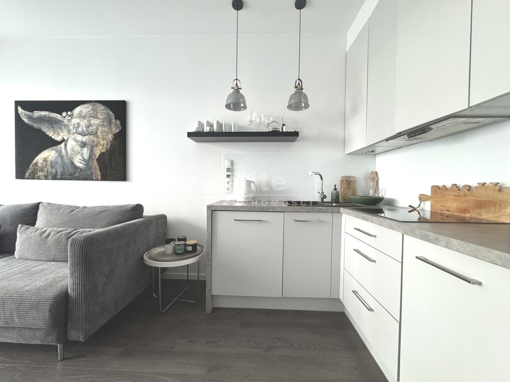 Kuchnia w pełni wyposażona w gustowne meble w zabudowie oraz sprzęt AGD: lodówkę, zmywarkę.
