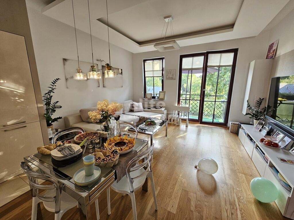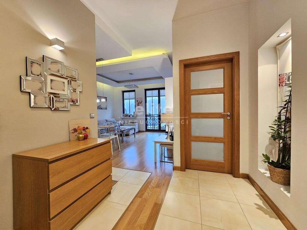 Apartament zadbany, zaaranżowany przez projektanta wnętrz w ciepłej kolorystyce. Uroku dodają drewniane okna z granitowymi parapetami. Wystawa okienna salonu i mniejszego pokoju południowo-zachodnia, pokoju dziecięcego wschodnia. W pokojach na podłodze znajduje się deska podłogowa w kolorze dębu. We wszystkich oknach plisy okienne. W pomieszczeniach drzwi drewniane dębowe.