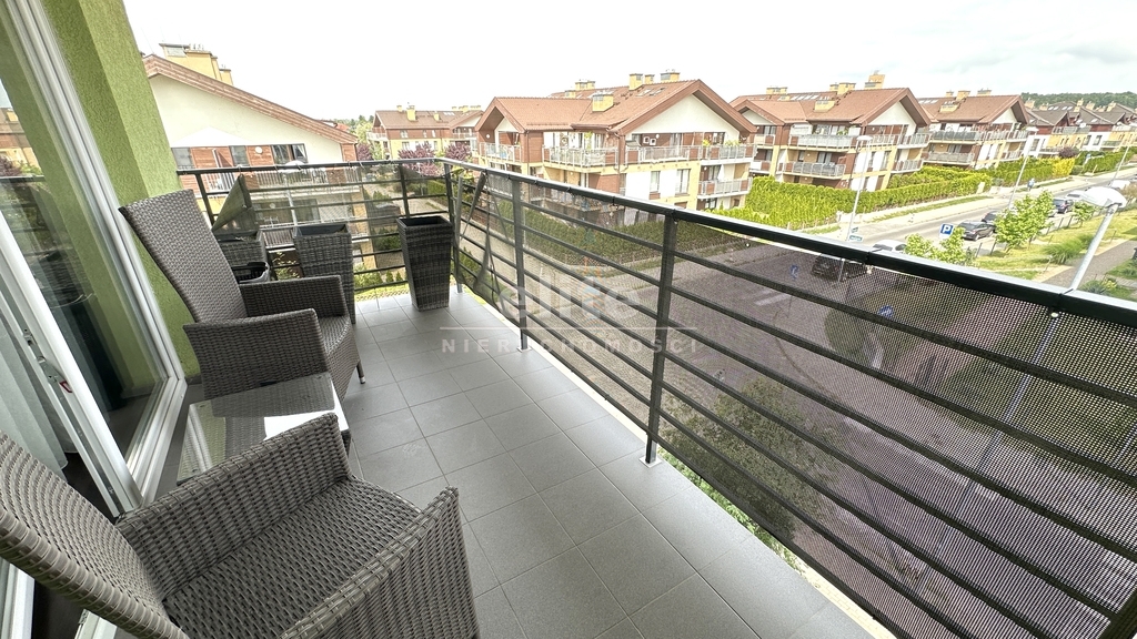 Salon z panoramicznymi oknami wyposażony jest w dużą, wygodną ,narożną kanapę, stolik, szafkę oraz zawieszony na ścianie telewizor oraz elektryczny, klimatyczny kominek. Z salonu można wyjść na balkon o pow. około 10 m kw. na którym znajdują się fotele oraz stolik.