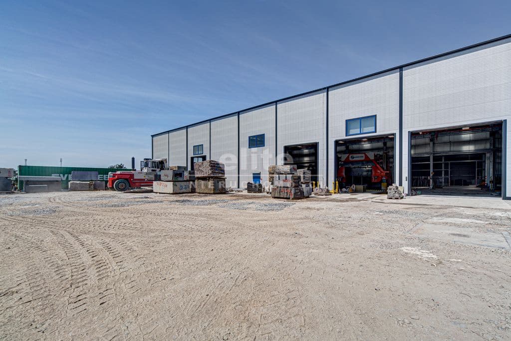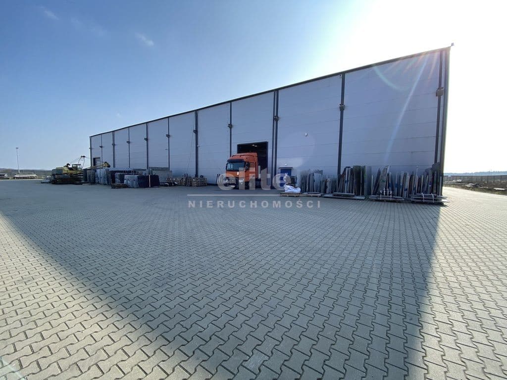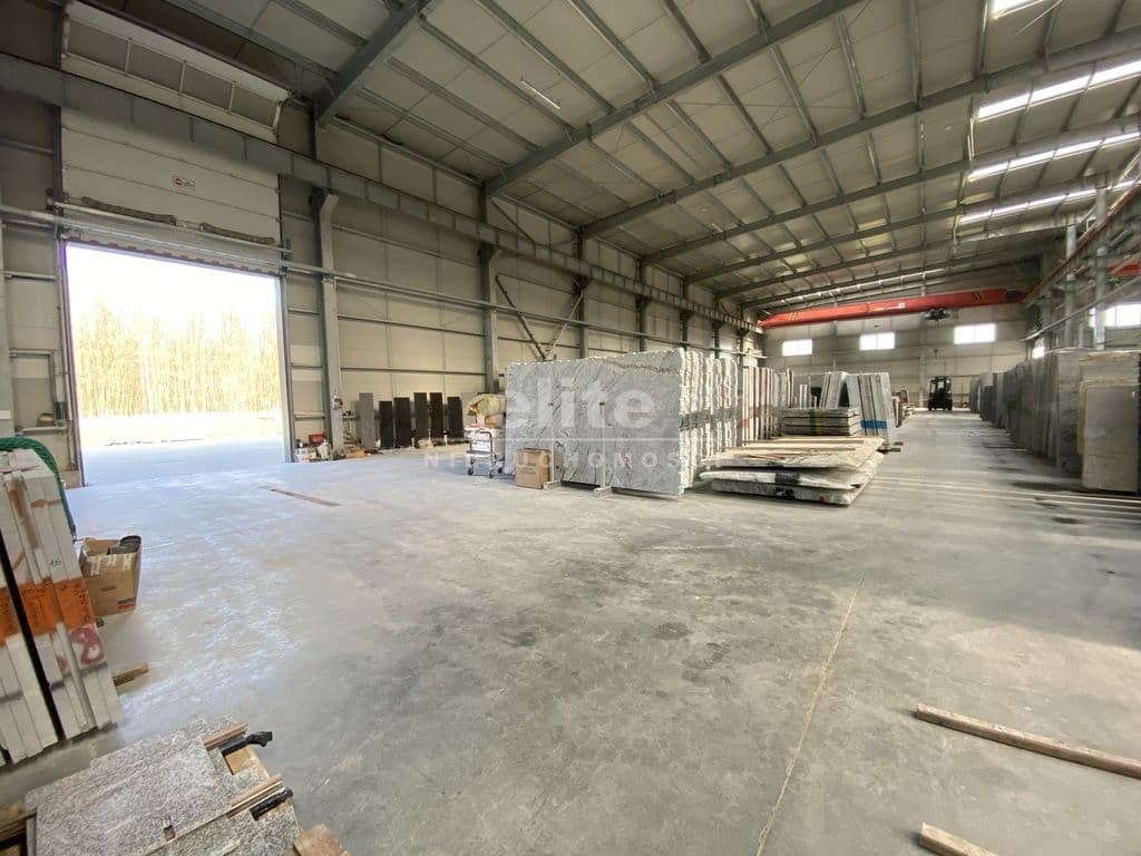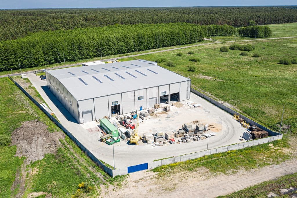 Hala produkcyjno-magazynowa o pow. użytkowej 3354,85 m2 jest podzielona na 3 części - magazyn płyt, hala obróbki i hala cięcia bloków. W obiekcie znajduje się dodatkowo część socjalna, w skład której wchodzą: pomieszczenie gospodarcze, szatnia z jadalnią, prysznic, 2 WC oraz przedsionki. Budynek wyposażony jest w 2 bramy o wymiarach 5 m x 5 m oraz 6 bram o wymiarach 4 m x 5 m (szerokość x wysokość) z dostępem z poziomu "0". Posadzka z płyty betonowej o grubości od 20 do 25 cm. Obiekt wykonany w technologii szkieletu stalowego pokrytego płytami warstwowymi ocynkowanymi. Dach dwuspadowy pokryty płytą trapezową warstwową. Wysokość hali wynosi ok. 12 m.
