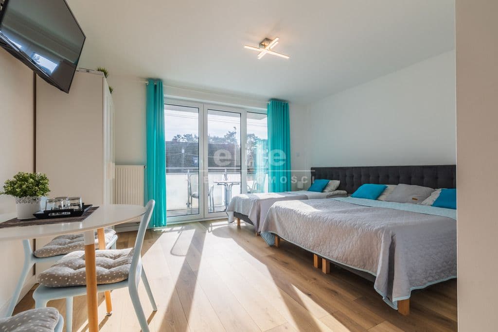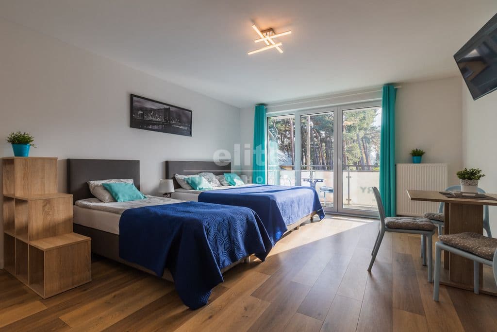 Pokoje wyposażone są w wygodne łóżka kontynentalne oraz sofy rozkładane, stoły wraz z krzesłami, szafy, tv 40 i 50 calowe.. W każdym z pokoi znajduje się także lodówka, mikrofalówka, czajnik, komplet naczyń, sprzęt plażowy.