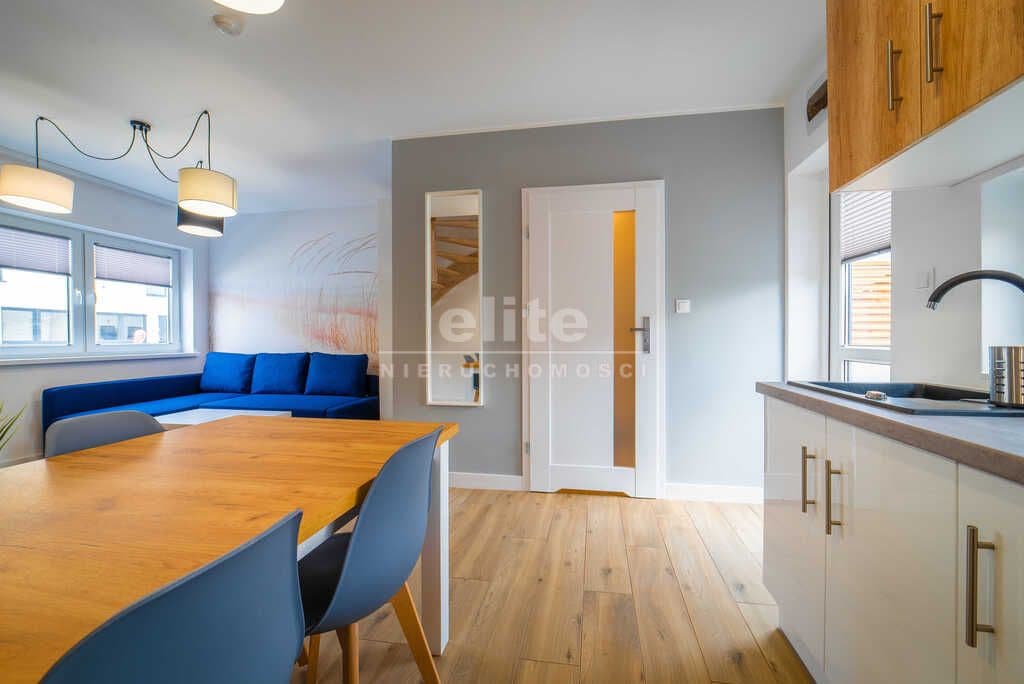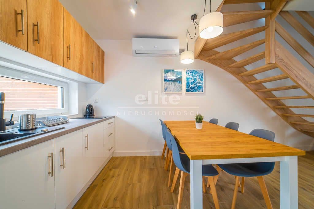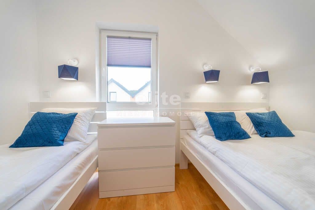 Rozkład domku: - Parter: Pokój dzienny (kanapa, stolik, szafa, telewizor), aneks kuchenny (w pełni wyposażony: lodówka, płyta indukcyjna, czajnik, ekspres do kawy, toster, talerze, sztućce, szklanki, garnki; stół z krzesłami), łazienka (kabina prysznicowa, wc, umywalka), taras (zadaszenie w formie markizy, grill, meble ogrodowe) - Poddasze: Sypialnia (łóżko pojedyncze, łózko podwójne, komoda), sypialnia (łóżko pojedyncze, łóżko podwójne, komoda, szafa), toaleta. - Na wyposażeniu domków: leżaki, parawany, parasole, pościel, ręczniki, dodatkowo: wszystkie akcesoria dla dzieci (łóżeczka, foteliki do karmienia, nocniki, bramki zabezpieczające, nakładki wc), wózki plażowe, żelazka, deski.