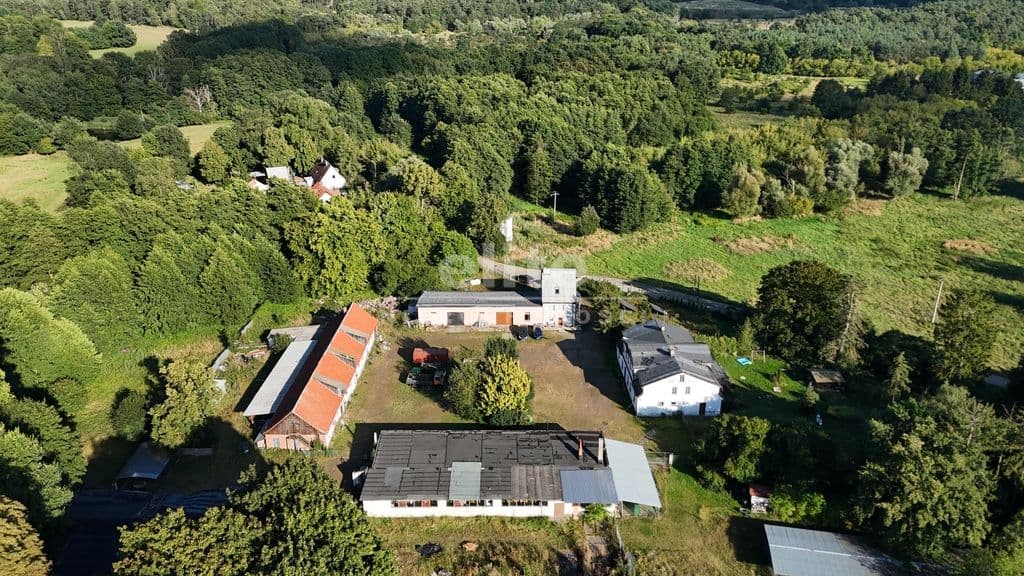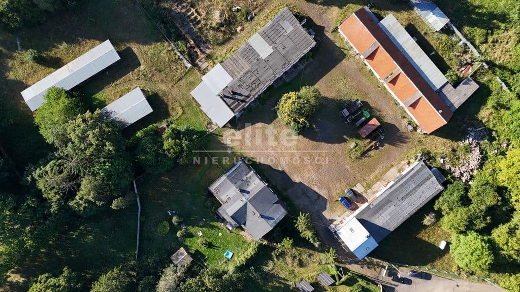 Na działce o pow. 6.44 ha jest dom mieszkalny (po remoncie) o pow. 106 m2). Dom ma dwa mieszkania. parter, kuchnia, pokój, łazienka oraz wejście do garażu (120 m2 ). Piętro z poddaszem (piętro: salon, kuchnia z jadalnią, WC, na poddaszu: sypialnia, łazienka i garderoba).