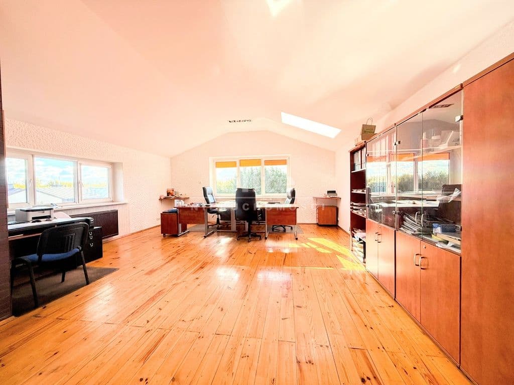 Część biurowa to 5 pokoi, duża łazienka i kuchnia.