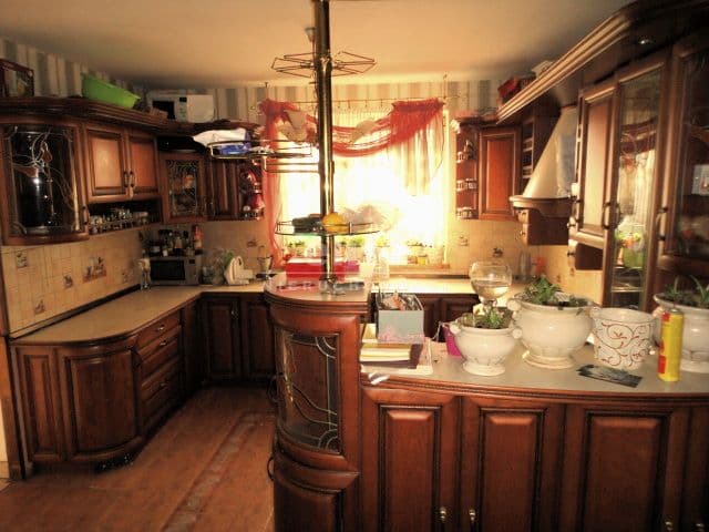 Wykończenie pomieszczeń mieszkalnych na I i II piętrze - na podłogach panele, ściany gładzone i malowane (do odświeżenia), okna pcv z okleiną drewnianą, ogrzewanie z kominka z płaszczem wodnym, kuchnie w zabudowie wyposażone, łazienki urządzone w glazurze i terakocie z białą armaturą. Lokal mieszkalny na parterze wymaga wykończenia, aktualnie jest w standardzie"developerskim". Do dokończenia jest wyłożenie podłóg, malowanie ścian, wykończenie kuchni i łazienki.